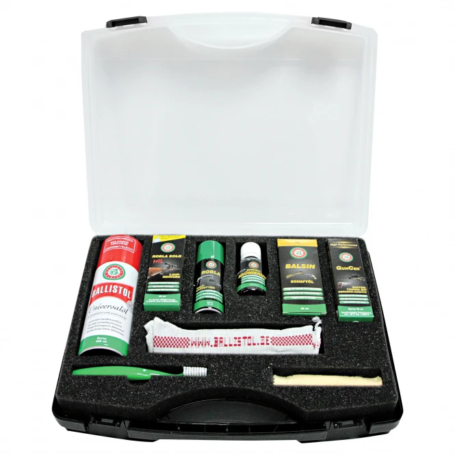 A 14 piece gun care set consisting of: Ballistol universal oil spray, Klever Quick Browning, Robla cold degreaser, Gunex 2000 gun oil, Baisin light stock oil, Sucolin silk tow, Robla Solo MIL, 2 goats hair brushes, a brush and 2 pull throughs.