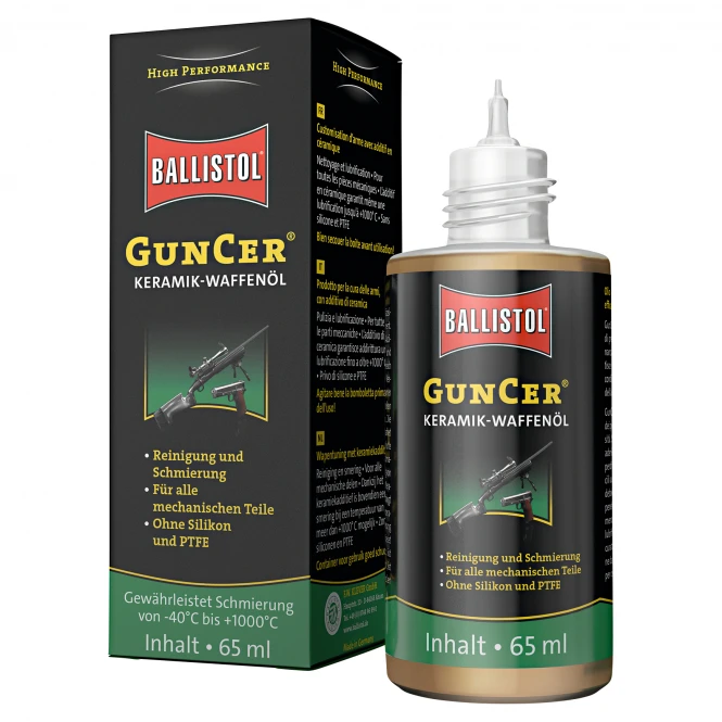 Gun Oil with ceramic additive without addition of silicone or PTFE. High good creeping oil, which ensures the functional reliability and shooting precision. Reduces wear, roughness and power losses. Corrosion protection. Content: 65 ml.