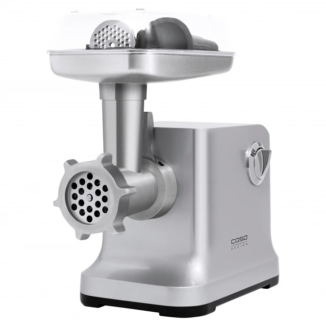 Product details: Cast aluminium housing. Forward and reverse. 2 speed settings. Powerful motor. High quality stainless steel blades. Easy removal of attachment. Metal gearbox. Large aluminium filling tray. Accessories included: 3 stainless steel blade sets: 3 mm (fine), 5 mm (normal) and 8 mm (coarse). Sausage filler. Spritz pastry attachment. Stopper.