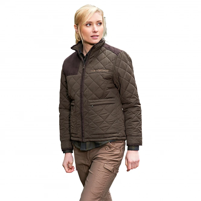 Elegant ladies quilted jacket in straight cut with microfiber trim on the shoulders and shoulder-chest area to the right. With two zipped pockets, high collar and buttoned cuffs that are trimmed with microfiber fabric. Hem in the back area is unbuttonable for more freedom of movement. Colour: dark olive / brown. Material: 100% polyester.