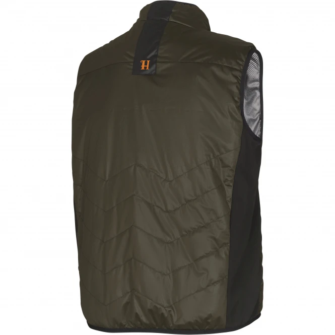 The Härkila Heat Vest is made of a lined, lightweight fabric with stretch membranes on the sides. The heat-reflective lining prevents heat loss and enhances the effect of the integrated heat membranes. The high collar is lined with soft fleece. There are integrated thermal membranes in the particularly cold-sensitive areas of the upper body – between the shoulder blades and in the lumbar region. With the help of the associated smartphone app, these heat membranes can be set to a desired temperature between 30 and 52 °C as needed. In addition, the membranes can also be set to 38, 46 or 52 °C without a smartphone or app using the push button on the chest. Unlike older heat technologies on the market, the heat membranes of the Härkila Heat Vest are so flexible that the waistcoat can still be folded effortlessly. In addition, the waistcoat can be machine washed without hesitation. In the right pocket of the waistcoat is a waterproof USB stick, so that a powerbank can be connected if needed or desired (powerbank not included). With a 10,000 mAh powerbank, the waistcoat will reach the maximum temperature of 52 °C for around 7 hours at outside temperatures of 0 °C. To save power, the heat membranes automatically switch to sleep mode when the waistcoat has reached the desired temperature. They then switch on again by themselves when the temperature drops 1-2 degrees below the set value. The waistcoat therefore has a heat-regulating function: the heat membranes switch off automatically when the body produces a lot of heat, e.g. during high activity, and switch on again when you stand or sit. The waistcoat has two side pockets, an inside pocket and a radio pocket on the left chest. Colour: willow green/black. Outer material: 100% polyester, polyurethane-coating, lining: 100% polyester.