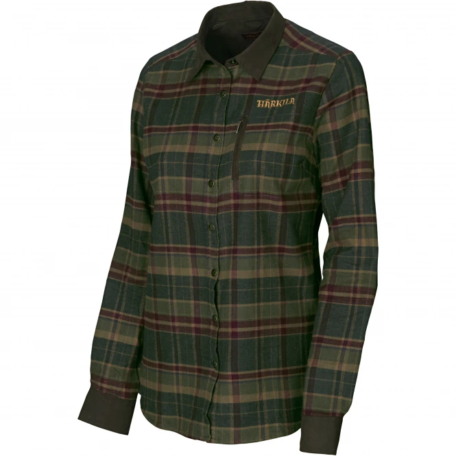 Soft flannel blouse in classic check with reinforcements of strong microsuede in particularly stressed places – collar, elbows and cuffs. With snap closure and a chest pocket on the left chest with vertical zipper. Feminine fit. Colour: rosin green check. Material: 100% cotton.