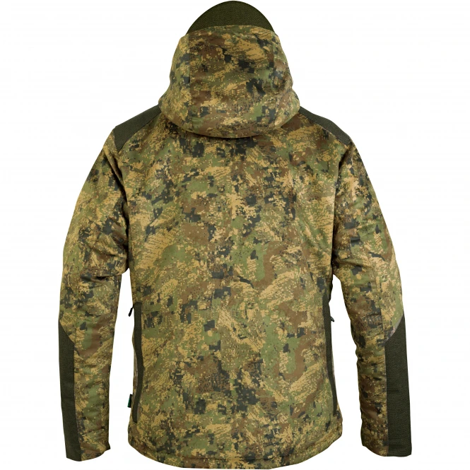 Lined all-terrain hunting jacket, perfect for cold winter days. Low noise and high quality cotton type durable fabric outside, warm insulation padding and windproof and waterproof OSMOTECH membrane inside. Its elegant design makes it wearable for all kinds of outdoor activities in winter. 2 waterproof zippered cargo pockets combined with side zippered pockets for extra storage or hand warmer. Waterproof zippered chest pocket. Detachable hood with various trim options to adjust and hard visor. 2 inside pockets: large pocket for stowing the removed hood, zippered chest pocket and media port for radio or documents. High waterproofness (8000 mm) and breathability (5000 gr/m2). Colour: pixel camo. Shell 1: 100% polyester, shell 2: 48% polyester, 36% nylon, 16% elastane, padding: 100% polyester, inner: 50% fluoro fiber, 50% polyester, lining 1: 100% nylon, linings 2, 3, 4 and 5: 100% polyester.