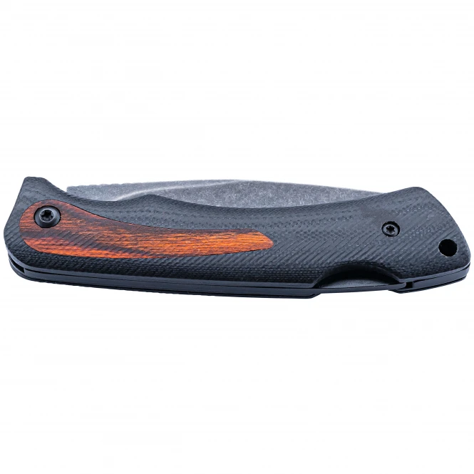Gentleman style pocket knife. Made of 420 stainless steel. Handle sheath G-10 with pakka wood. Blade length: 7.5 cm. Total: 17.5 cm. Weight: 72 g.