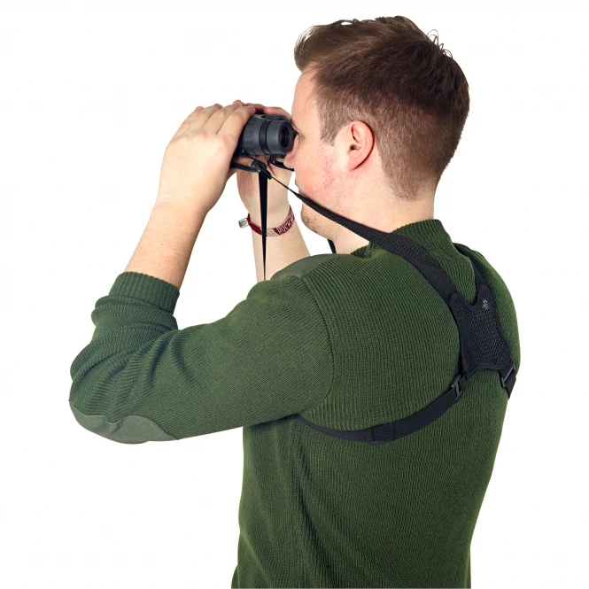Binoculars halter strap. Elastic. Colour: black. Material: back part: 100% polyester, belt strap: 100% rubber.