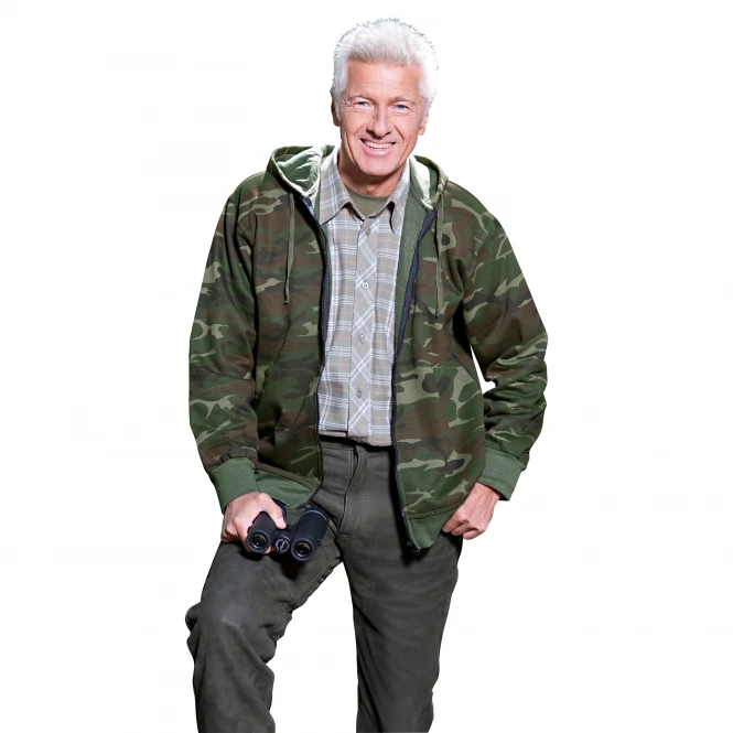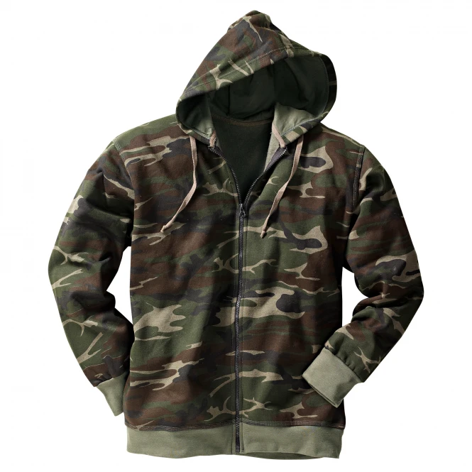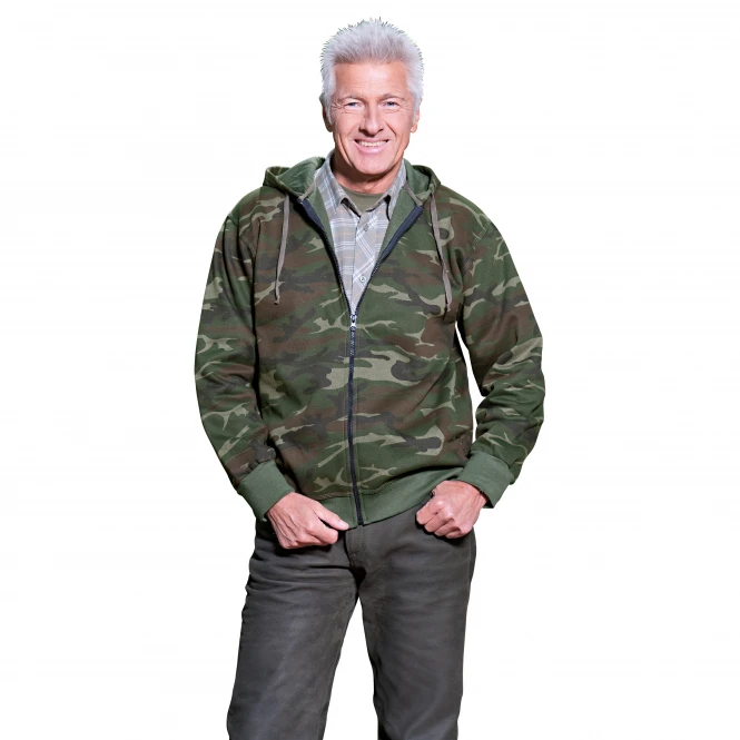 With a full length zip fastener and with draw cord adjustable hood this hoodie is a classic for outdoor pursuits. It has elasticated waistband and cuffs. Colour: woodland camouflage. Material: 50% cotton, 50% polyester.