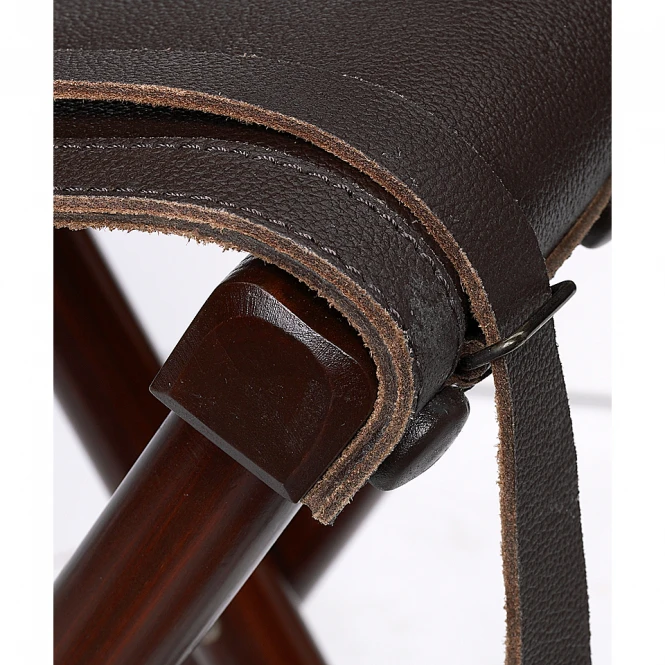 A four legged stool with a large seating area and sturdy legs. With carrying strap. Height: 55 cm Seating area: 35 x 34 cm. Material: Leather (Seat) & Wood (Legs).