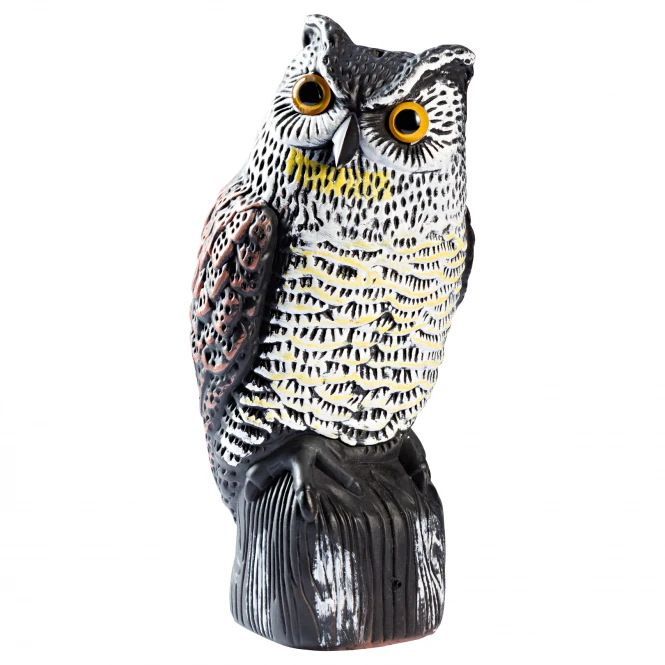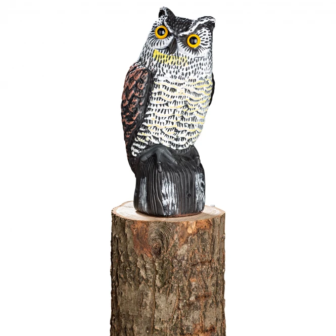 To attract ravens. This dummy reproduces the noises of an eagle owl. Since ravens see the eagle owl as enemy, they come closer and try to attack the eagle owl. This moment can be used to shoot the ravens. 3 x AA batteries are needed (not included). Height: 40 cm.