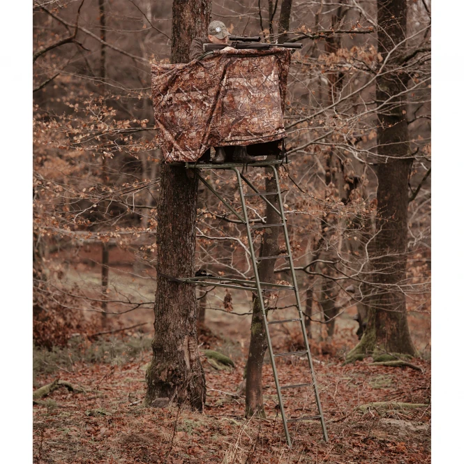XL mammoth tree ladder for 2 people, kept very wide and thus easily occupied by 2 people and equipment. A wide rifle rest provides the appropriate support for a precise safe shot. Due to the large foot platform, comfortable fatigue-free sitting is possible even during long Ansitz. The ladder is coated with weatherproof, corrosion-free powder paint and is therefore very well protected against corrosion. Supplied with padded seat cushion, arm and gun rest. Height: 520 cm. Seat area: 115 x 35 cm. Max. Load capacity: 300 kg. Transport length: approx. 150 cm. Total weight: approx. 43 kg. Assembly time: approx. 60 – 120 minutes. Colour: olive green.