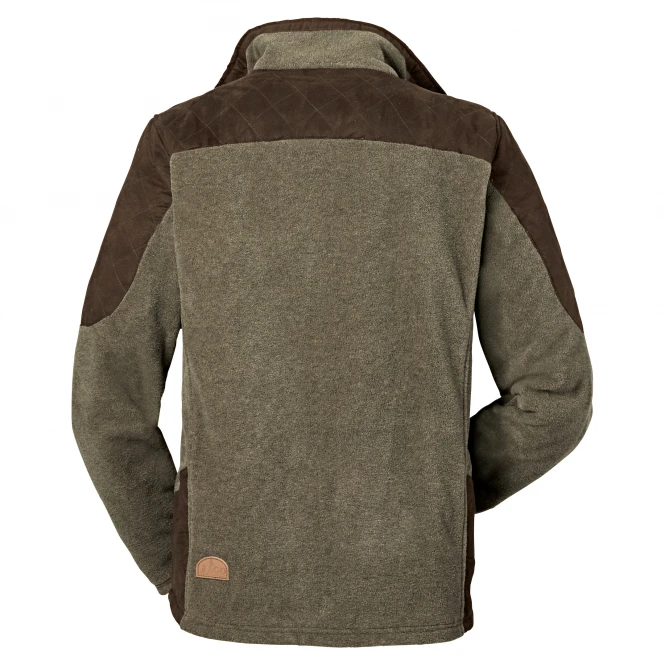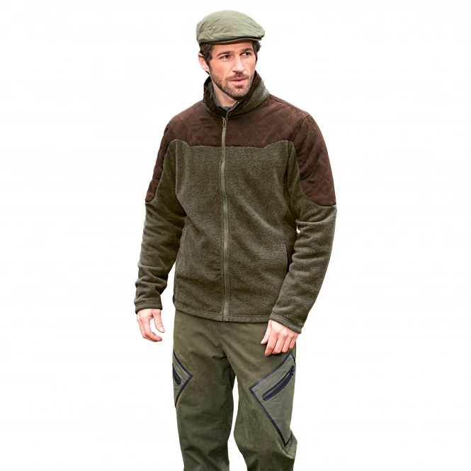 Particularly warm, yet breathable fleece jacket with applications of microfiber fabric on the shoulder and upper arm parts, the hips and the collar. The silent fleece material features high wearing comfort. With two pockets, high collar and storm flap. Colour: olive, applications: brown. Material: 100% polyester. Contains non-textile parts of animal origin.