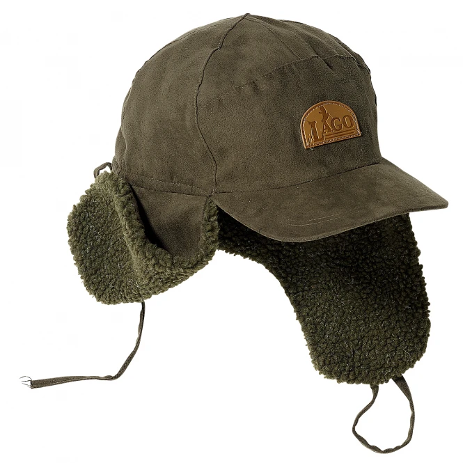Beautiful winter hat in a velvet look with quilted lining. Fitted with folding ear flaps from teddy fleece. One size fits all. Colour: olive. Outer material: 100% polychlorid, lining: 65% cotton, 35% polyester, ear flaps: 100% polyester. Contains non-textile parts of animal origin (Leather logo).