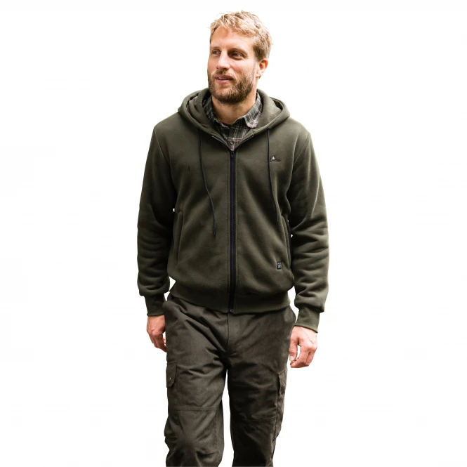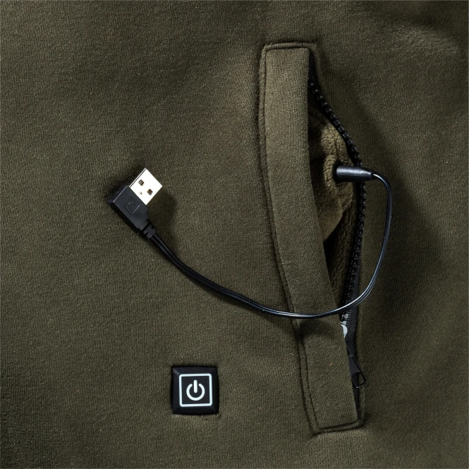 Lined with soft fleece. Differently mounted heating rods distribute a cozy warmth and prevent cooling. Heat supply adjustable in 3 levels, 45 °C, 50 °C and 55 °C. 2 side pockets with zipper. USB power operation. Colour: olive.Requires a powerbank not included. Please order separately. Upper material: 73.0% cotton, 20.8% polyester, 6.2% elastane, lining: 100% polyester.