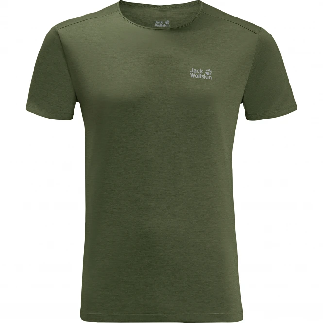 Round neck T-shirt with short sleeves and Jack Wolfskin lettering on the upper left chest. Colour: greenwood. Material: 100 % polyester.