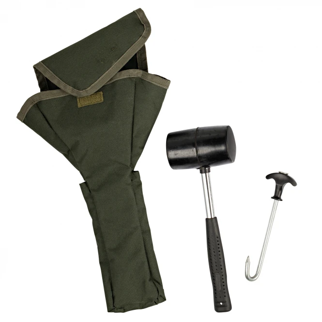 Set of rubber hammer and practical tent peg remover as reliable tools for the assembley and dismantling of tents. The delivery takes place in a practical transport bag on which also the tent pegs still find place.