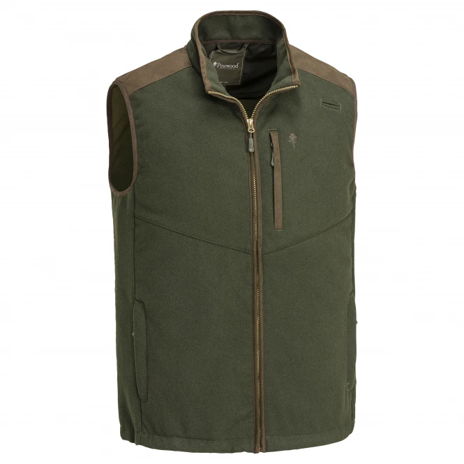 Low-noise waistcoat with soft brushed fleece material inside. With faux leather details and practical antenna opening on the breast pocket. Colour: mossgreen, suede brown. Material: 50 % wool, 50 % polyester, contrasts: 100 % polyester.