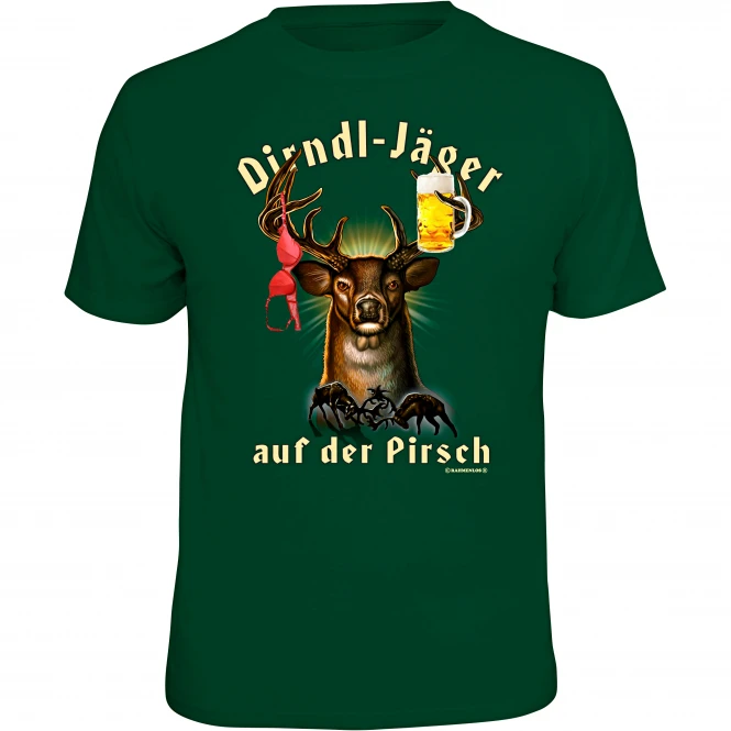 Comfortable, straight cut short-sleeved shirt with a high crew neck. Ideal for a trip to the area, but also suitable for everyday life. The large print and the german lettering on the front illustrate in a humorous way your love for the hobby: “Dirndl hunters on the stalk”. The material is comfortable to wear. Colour green. Material: 100% cotton.