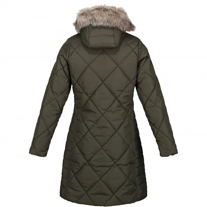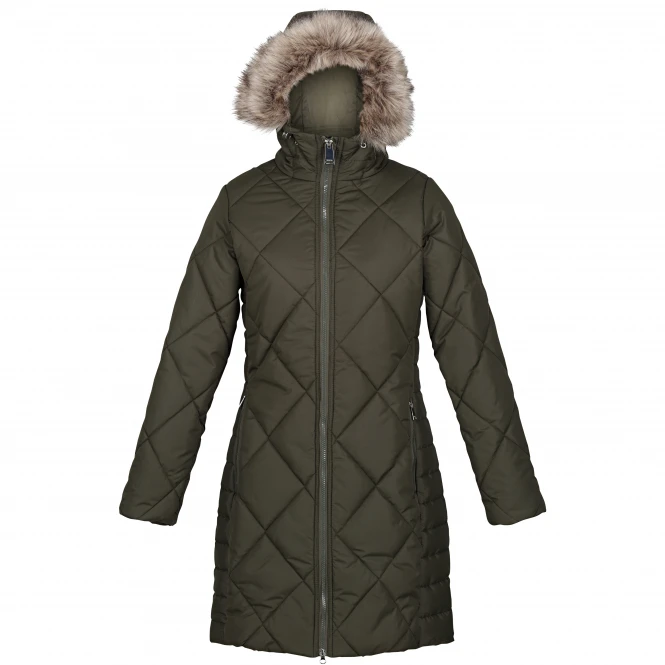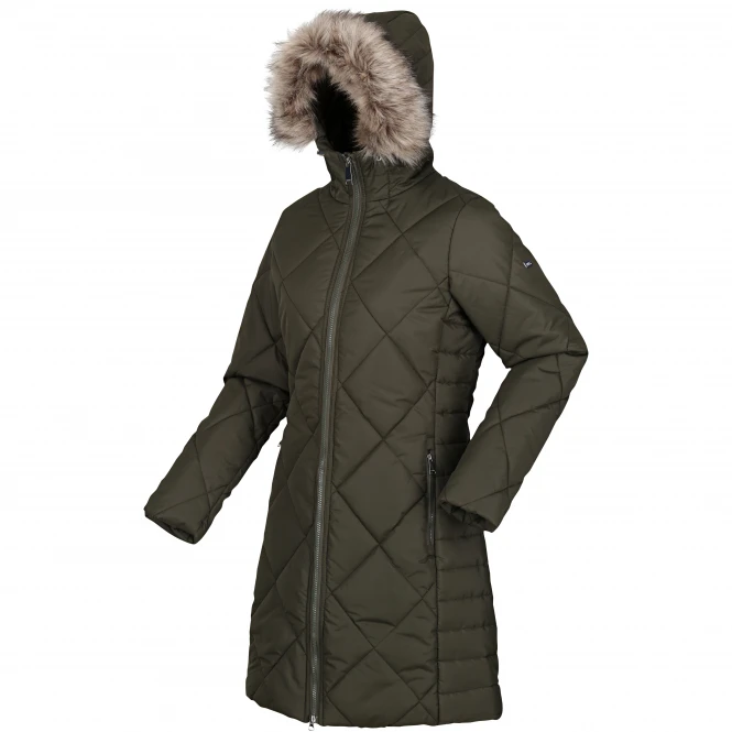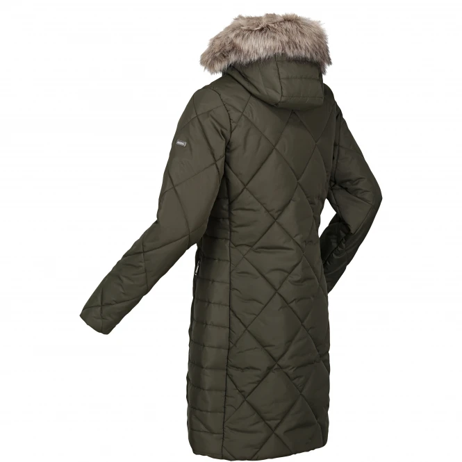 Thanks to the Thermoguard insulation creates a pleasant warmth. Feminine cut. With water-repellent coating, adjustable hood with faux fur, 2-way front zipper, integrated security pocket and 2 deep zippered pockets. Colour: dark khaki. Shell, lining and padding: 100% polyester.