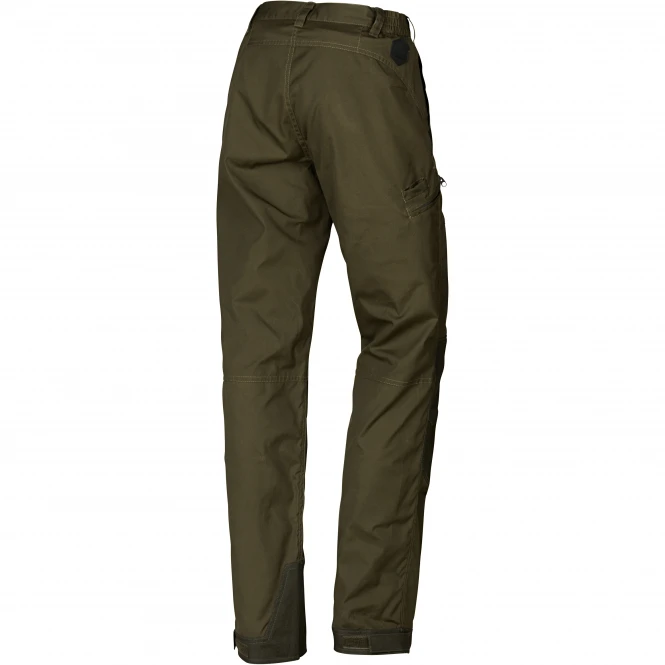 Durable trousers with knee reinforcement, thigh pocket with zip, knife pocket and adjustable bottom hem. With breathable, wind- and waterproof SEETEX® membrane. Water column: 10,000 mm, breathability: 10,000 g/m²/24h. Colour: pine green. Upper material: 65% polyester, 35% cotton, waxed, lining: 100% polyester.