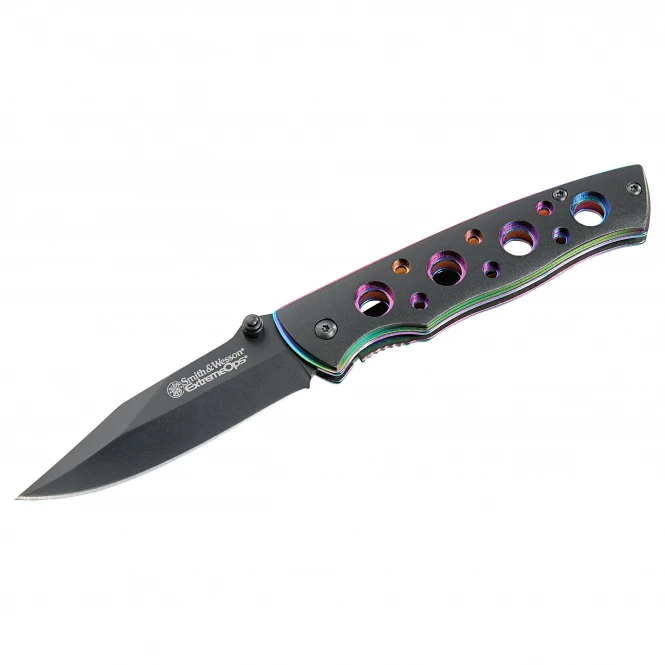 The black coated clip point blade is made of stainless 7Cr17 steel. With aluminum shell and belt clip. Blade length: 7.0cm, total: 16.9cm. Weight: 63g.