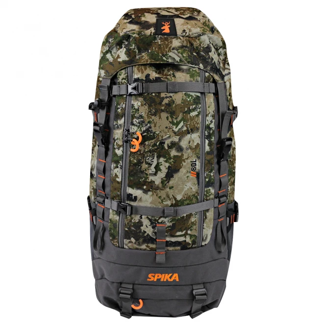 Durable 500D DWR reinforced nylon shell with reinforced bottom. The front pocket can store essential gear, while the main compartment can be accessed via a full-length front zip or a traditional top opening. With side pockets, reinforced areas in high-wear areas, padded straps and hip belt, load-stabilising frame, many straps, compartments, attachment options for a wide range of accessories, e.g. water bottle, hiking pole, ice axe. Incl. rain cover. Volume: 80 litres. Colour: Biarri Camo. Material: Upper material: water-repellent impregnated nylon, lining: textile.