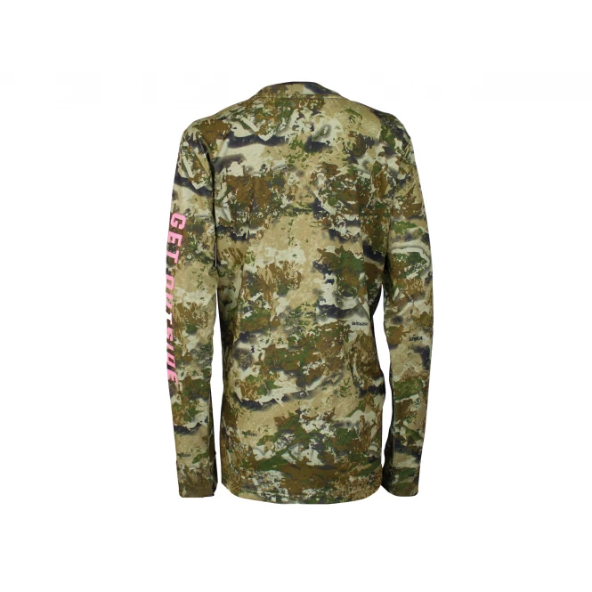 Breathable long-sleeved shirt with a high round neck. The pleasantly straight cut allows ideal freedom of movement. With contrasting Spika lettering on the front in fresh pink. Colour: biarri camo. Material: 95% polyester, 5% spandex.