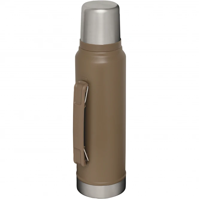 The Classic vacuum bottle by Stanley is made of 18/8 stainless steel and has a protective lacquer finish. The double-walled vacuum insulation keeps your drink hot or cold for up to 24 hours. The side-mounted plastic carrying handle makes it easy to transport the bottle. The Classic Vacuum Bottle is equipped with a drinking cup above the bottle cap, which is also insulating. The 5 cm wide opening makes the Stanley Classic vacuum bottle very easy to clean. In Peter Perch design. Volume: 1 litre. Height: 35 cm. Empty weight: 834 g.