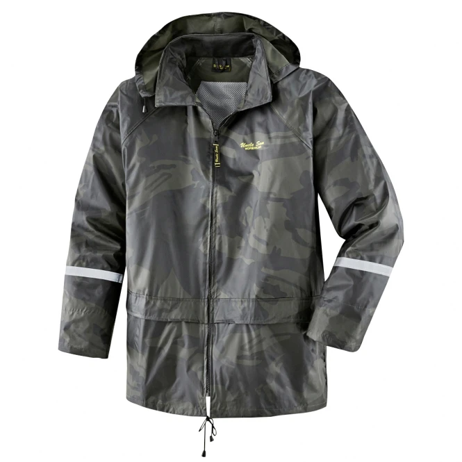 Wind and waterproof rain jacket with allover print and reflective tapes on the sleeves. Color: camou. Material: 100% polyester