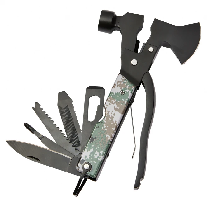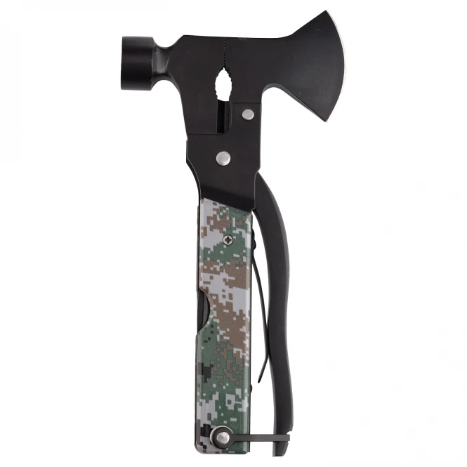 Multi-function tool Askador in Multicam camouflage design. The Askador multifunction tool is your ideal camping companion. Whether you want to split something briefly, fasten a nail or need the perfect grip of a pair of pliers. The 16 in 1 multitool leaves hardly anything to be desired and is available in a beautiful Multicam Camo design. Pliers, flat jaw pliers, hammer, axe, cable cutter, arrows, slotted screwdriver, Allen key, bottle opener, saw and fishhook remover, Phillips screwdriver, knife.